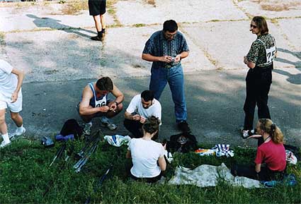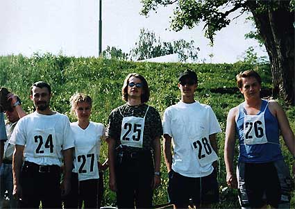 лiнiйки", учасники стали на позначенi крейдою мiсця. Мiсцевi жаби, зручно